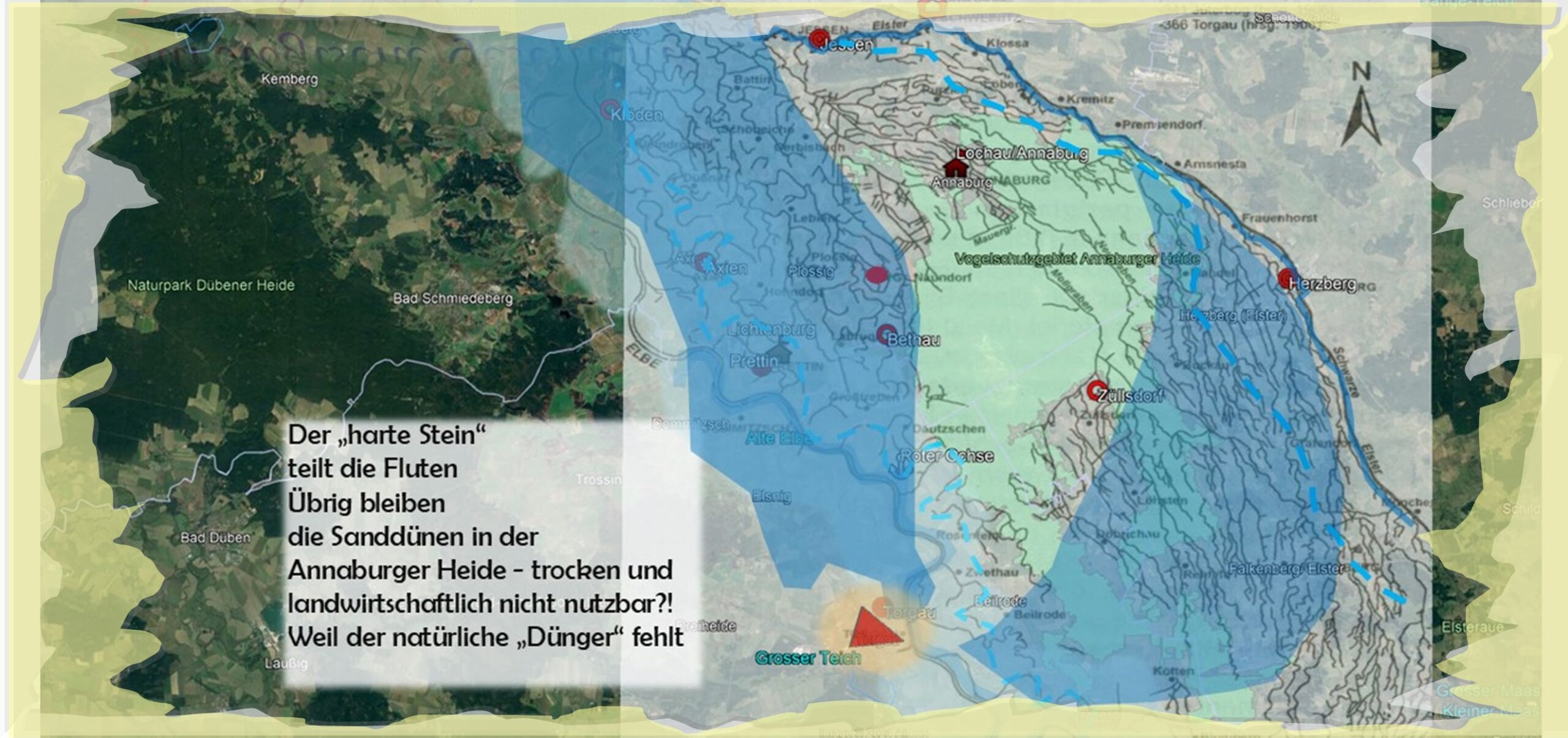 Bei Risa verlässt die Elbe ihr enges Flusstal und trifft auf die flache Landschaft des ehemaligen eiszeitlichen Urstromtal, was durch Elster und Elbe bei der letzten großen Eiszeit sich gebildet hat. Das landschaftliche Gefälle in Flussrichtung beträgt ungefähr 1 m auf 25 km – anschaulicher 1 cm auf 25 m. Da der Flusslauf nicht mehr durch das Tal eingeengt ist, kann sich der Fluss leichter und ungehinderter verbreitern. Das führt bei entsprechenden Hochwasserereignissen zu gelegentlichen Laufveränderungen. Auch war zeitweilig der Flusslauf aufgespalten und es waren neben dem Hauptstrom, ein- oder mehrere Nebenarme vorhanden. Ein Hindernis stellte sich dem abfließenden Elbwasser immer entgegen – der harte Stein. Gemeint ist die Gegend um Torgau mit ihrem felsigen Untergrund auf dem Burg und Stadt später errichtet wurde. Dieses natürliche Hindernis teilte bei entsprechenden Hochwasserereignissen die Fluten. Auf diese Art entstand der erhöhte Bereich der Annaburger Heide, deren Sanddünenlandschaft durch den entstandenen Wald für die Zukunft konserviert wurde.